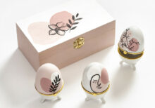 Πασχαλινό σετ δώρου σε ζωγραφιστό κουτί σε χρώμα σάπιο μήλο με λουλούδια. Στο κουτί περιλαμβάνονται τρία ζωγραφιστά αυγουλάκια σε αποχρώσεις του σάπιου μήλου με γραμμικά σχέδια. Αυγά άνοιγμα στη μέση: 5.8x9cm |