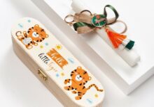 Πασχαλινή λαμπάδα κασετίνα με print αυτοκόλλητο τιγράκι. Η λευκή λαμπάδα είναι διακοσμημένη με μεταλλικό μπρελόκ τίγρης.