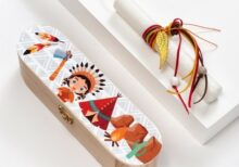 Πασχαλινή λαμπάδα κασετίνα με print αυτοκόλλητο ινδιάνο. Η λευκή λαμπάδα είναι διακοσμημένη με μεταλλικό χρυσό φτερό.
