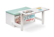 Le cirque magnifique. Ξύλινο κουτί βαπτιστικών παγκάκι-θρανίο με βεραμάν μαξιλάρι. Το κουτί είναι βαμμένο σε λευκό χρώμα. Στην πλάτη είναι ζωγραφισμένο το καπέλο του μάγου. Στο παγκάκι υπάρχουν δύο ξύλινες παραστάσεις με ζωάκια να κάνουν διάφορα ακροβατικά.