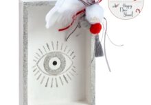 Χριστουγεννιάτικο ξύλινο διακοσμητικό παραλληλόγραμμο καδράκι σε λευκό-ασημί glitter χρώμα. Το καδράκι στο εσωτερικό είναι ζωγραφισμένο με μάτι και στο εξωτερικό είναι διακοσμημένο με σύνθεση από φτερά, pompom . |