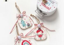 Χριστουγεννιάτικο σετ δώρου σε χάρτινο λευκό βαλιτσάκι Princess 1st Xmas . Mέσα περιλαμβάνει 3 ξύλινα ζωγραφιστά στολίδια, διακοσμημένα με κορδέλες και pom pom.