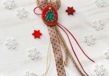 Χριστουγεννιάτικο κρεμαστό γούρι. Το δέσιμο έχει γίνει με κορδόνι γιούτα και καφέ γκρο κορδέλα με print αστέρια. Τη σύνθεση ολοκληρώνει ξύλινος κορμός στον οποίο είναι ζωγραφισμένο χριστουγεννιάτικο έλατο. |