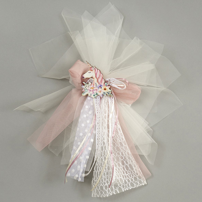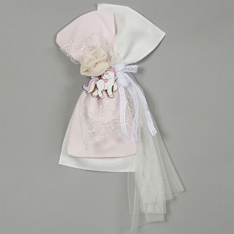 Μπρανς Βάπτισης σε Ροζ και Λευκό Χρώμα με Δαντέλα με Θέμα Μονόκερος