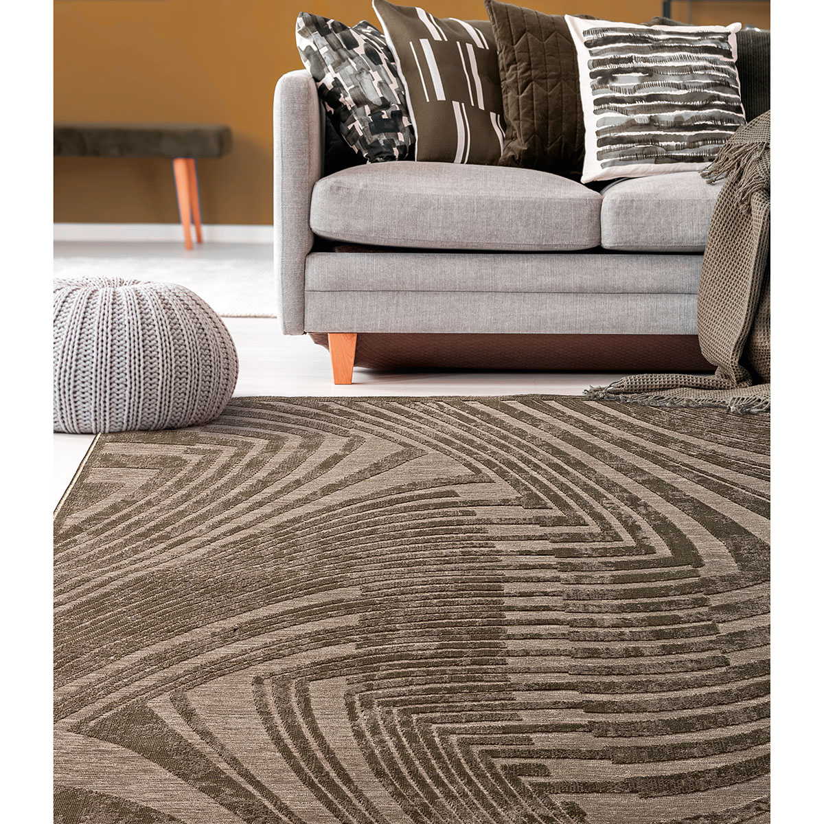 Stylish interior of living room with small design table and sofa