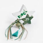 Χριστουγεννιάτικο ξύλινο διακοσμητικό αστέρι με την φράση Noel σε λευκές – πράσινες αποχρώσεις και ζωγραφισμένο από την πίσω πλευρά με χριστουγεννιάτικη κόκκινη κάλτσα.