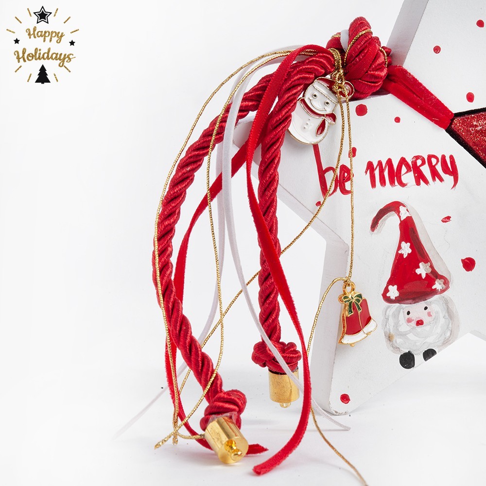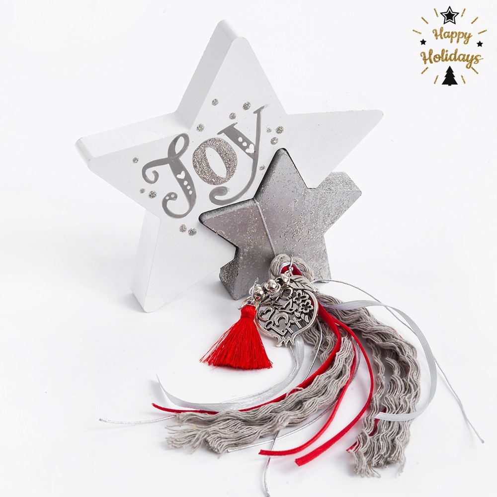 Χριστουγεννιάτικο ξύλινο διακοσμητικό αστέρι με την φράση “BE MERRY AND BRIGHT” σε κόκκινες- λευκές αποχρώσεις διακοσμημένο με κορδέλες και μοτιφ, στην πίσω πλευρά είναι ζωγραφισμένος ο Αϊ Βασίλης.