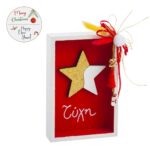 Χριστουγεννιάτικο ξύλινο διακοσμητικό παραλληλόγραμμο καδράκι σε λευκό-κόκκινο χρώμα. Το καδράκι στο εσωτερικό είναι διακοσμημένο με ξύλινο αστέρι και στο εξωτερικό με σύνθεση από αποξηραμένα λουλούδια.