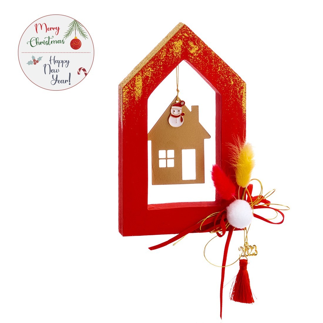 Χριστουγεννιάτικο ξύλινο διακοσμητικό τετράγωνο καδράκι σε λευκό-κόκκινο χρώμα. Το καδράκι είναι διακοσμημένο με σύνθεση από αποξηραμένα λουλούδια.