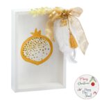 Χριστουγεννιάτικο ξύλινο διακοσμητικό παραλληλόγραμμο καδράκι σε λευκό-χρυσό χρώμα. Το καδράκι στο εσωτερικό είναι ζωγραφισμένο με ρόδι και στο εξωτερικό είναι διακοσμημένο από φτερά.