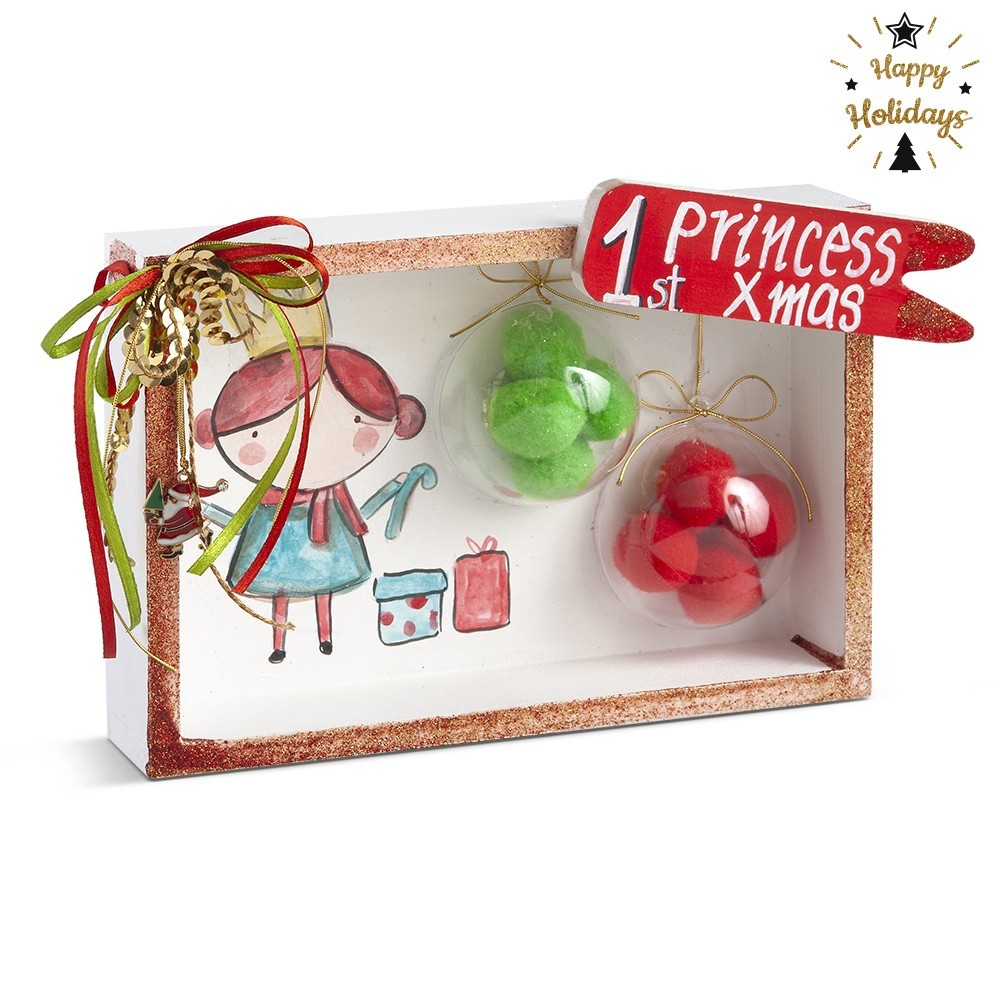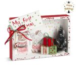 Χριστουγεννιάτικο ξύλινο διακοσμητικό παραλληλόγραμμο καδράκι My First Xmas σε λευκό χρώμα διακοσμημένο με κόκκινα αστεράκια glitter.Στο εσωτερικό του είναι ζωγραφισμένη παράσταση και διακοσμημένη με δωράκια και Χριστουγεννιάτικο δέντρο .