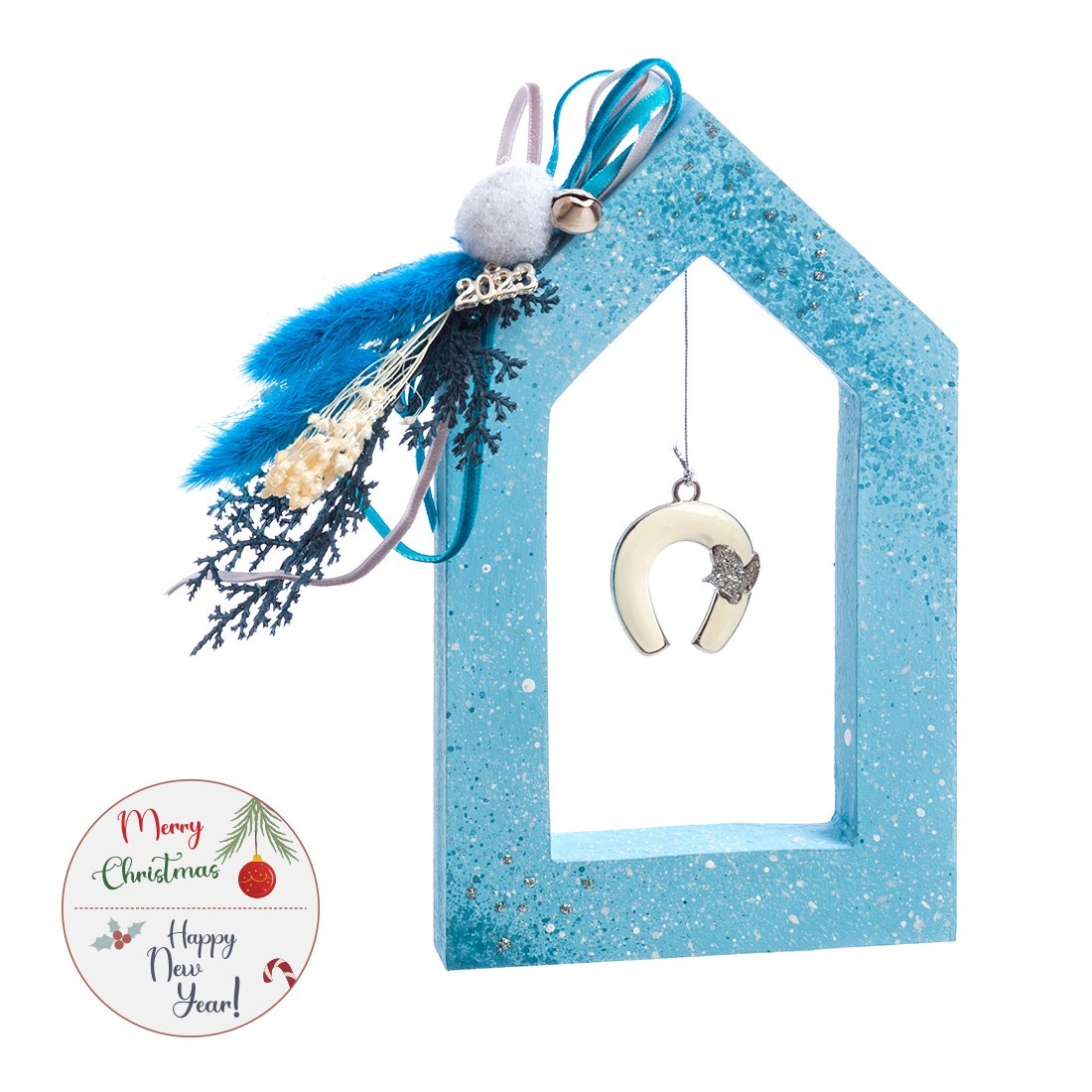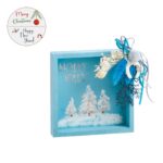 Χριστουγεννιάτικο ξύλινο διακοσμητικό τετράγωνο καδράκι σε σιελ χρώμα. Το καδράκι στο εσωτερικό είναι ζωγραφισμένο με παράσταση “χιονισμένο τοπίο”και στο εξωτερικό με σύνθεση από αποξηραμένα λουλούδια.