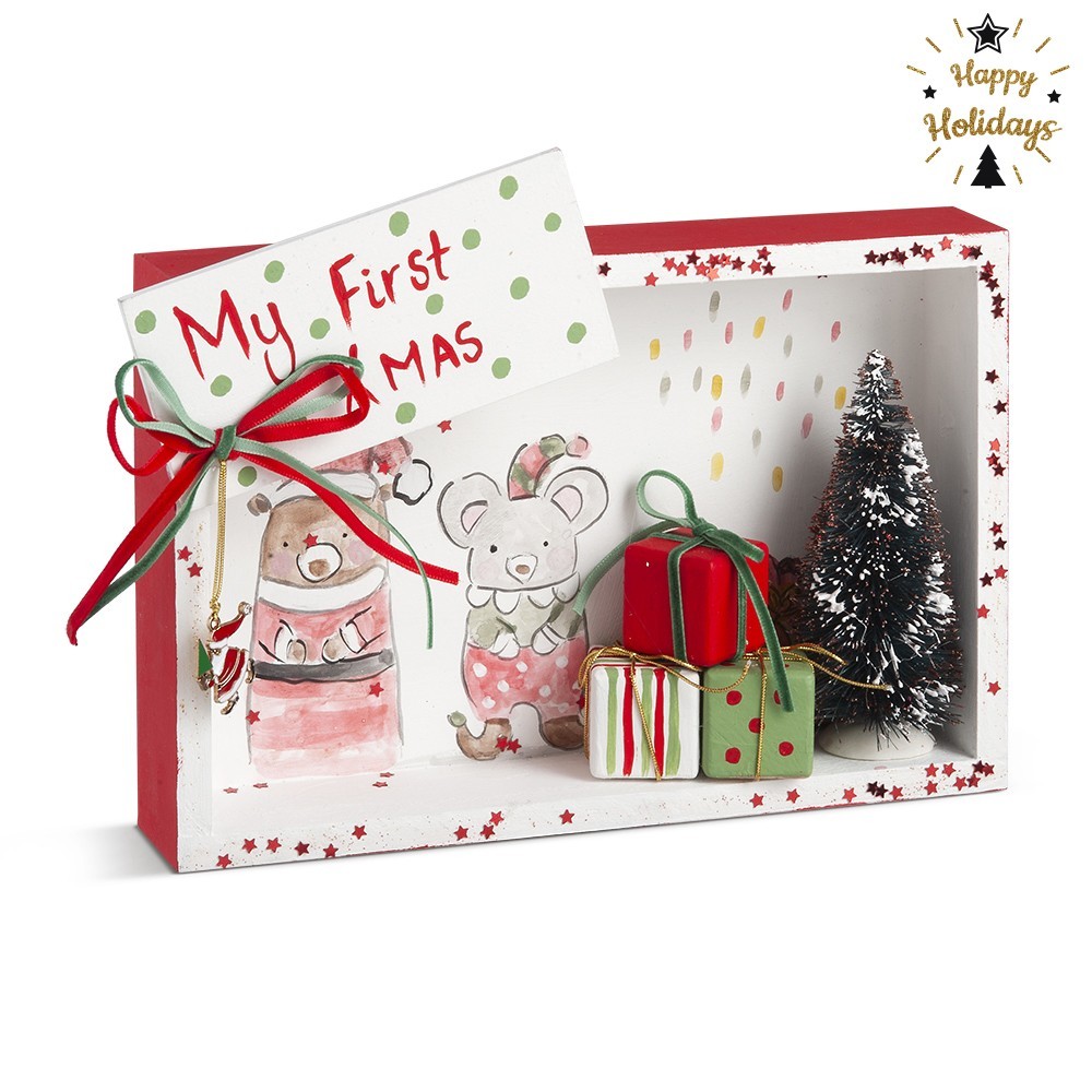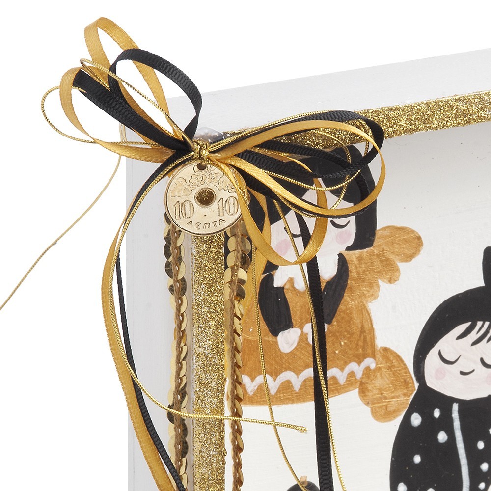 Χριστουγεννιάτικο ξύλινο διακοσμητικό παραλληλόγραμμο καδράκι It’s a boy/It’s a girl σε λευκό-χρυσό χρώμα. Το καδράκι στο εσωτερικό είναι ζωγραφισμένο με παράσταση σε χρώμα χρυσό- μαύρο.