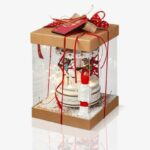 Χριστουγεννιάτικο καρουζέλ με φωτάκια led σε κουτί. Περιλαμβάνει ξύλινο μουσικό καρουζέλ σε λευκό -χρυσό χρώμα με πολύχρωμα αλογάκια και διακοσμητικό χιόνι. Το κουτί είναι στολισμένο με κορδέλες και ξύλινη ετικέτα αποστολής.