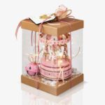 Χριστουγεννιάτικο καρουζέλ με φωτάκια led σε κουτί. Περιλαμβάνει ξύλινο μουσικό καρουζέλ σε ροζ χρώμα και διακοσμητικό χιόνι. Το κουτί είναι στολισμένο με κορδέλες και ξύλινη ετικέτα αποστολής.