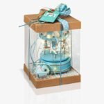 Χριστουγεννιάτικο καρουζέλ με φωτάκια led σε κουτί. Περιλαμβάνει ξύλινο μουσικό καρουζέλ σε σιελ χρώμα και διακοσμητικό χιόνι. Το κουτί είναι στολισμένο με κορδέλες και ξύλινη ετικέτα αποστολής.