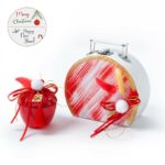 Xριστουγεννιάτικο σετ δώρου που περιλαμβάνει: α)γυάλινο μήλο σε κόκκινο χρώμα β) χάρτινο λευκό βαλιτσάκι με κόκκινα σβησίματα.