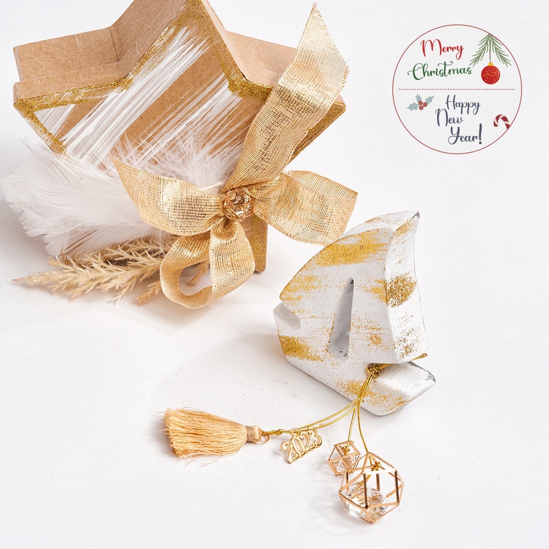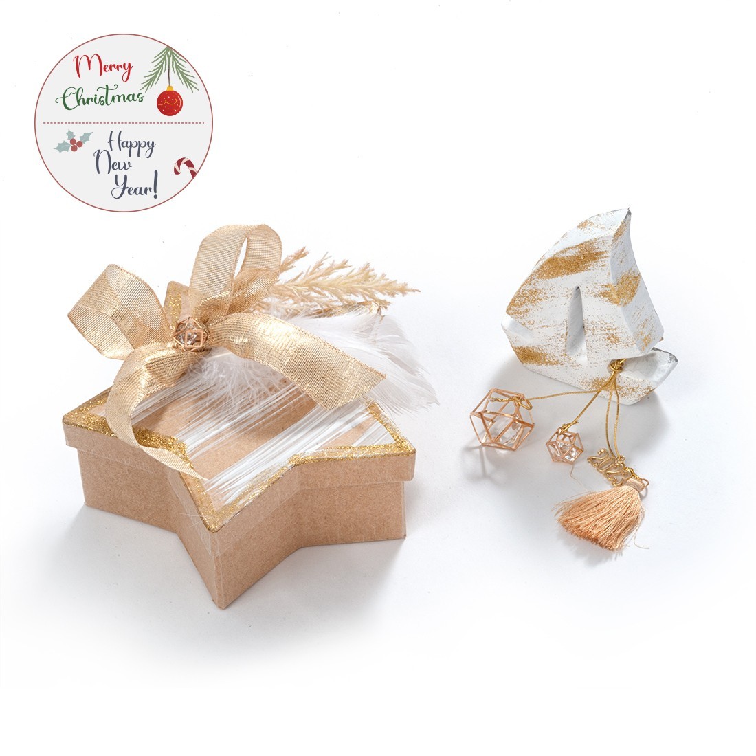 Χριστουγεννιάτικο σετ δώρου που περιλαμβάνει: α)τσιμεντένιο καραβάκι σε λευκό χρώμα με χρυσά glitter σβησίματα και β)χάρτινο κουτί σε σχήμα αστεριού.