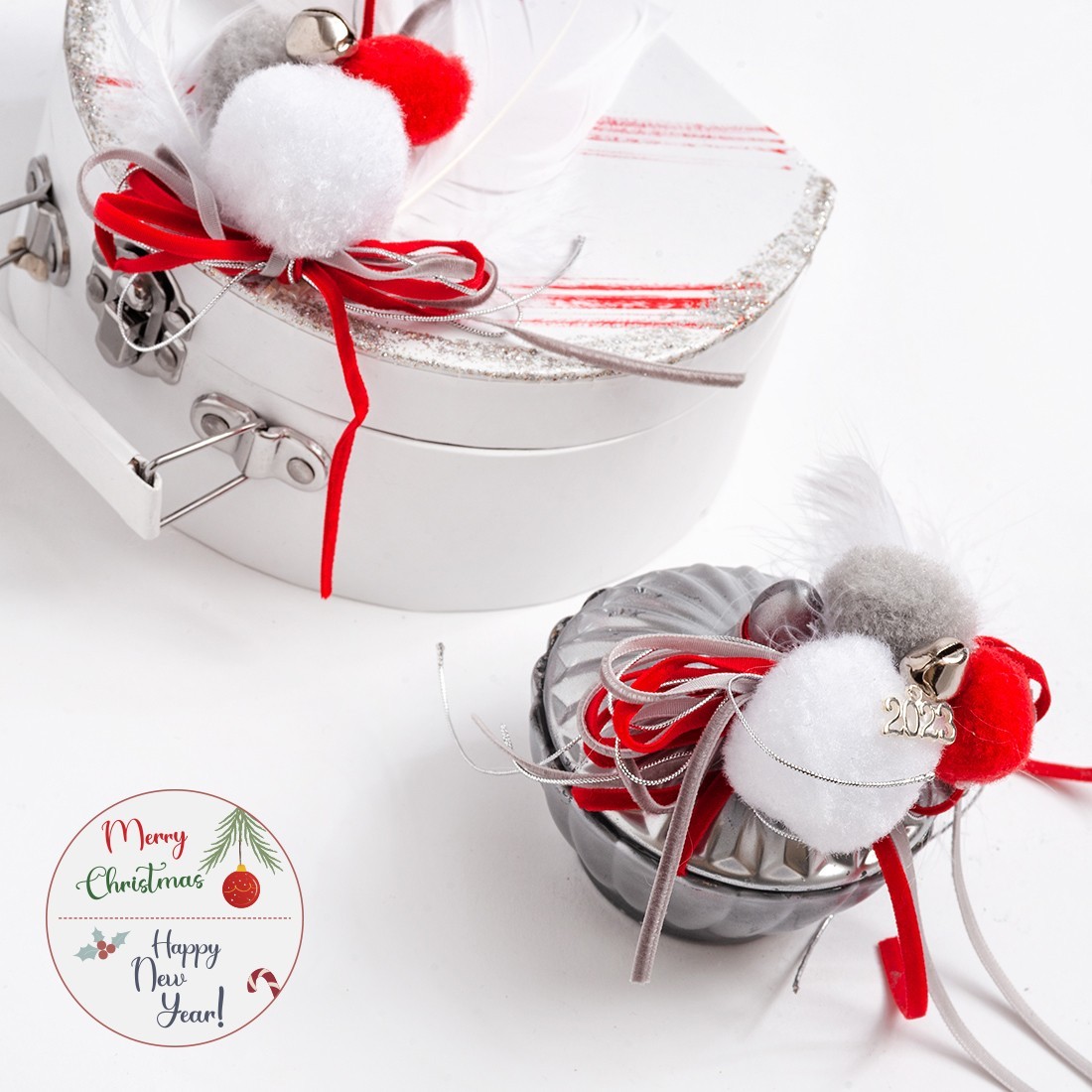 Xριστουγεννιάτικο σετ δώρου που περιλαμβάνει: α)γυάλινη φοντανιέρα στολισμένη με σύνθεση από φτερά, διαμαντάκι και μεταλλικό μοτίφ και β) χάρτινο λευκό βαλιτσάκι με χρυσά glitter σβησίματα.