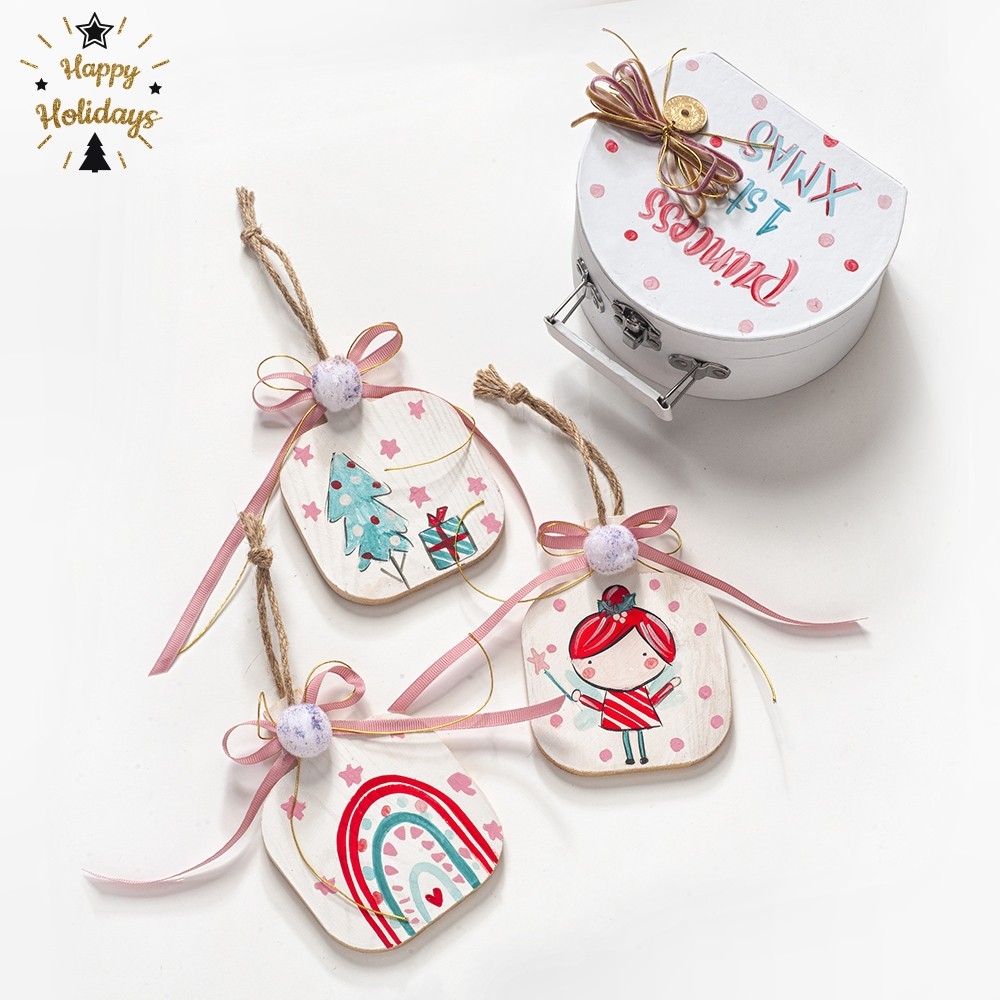 Χριστουγεννιάτικο σετ δώρου σε χάρτινο λευκό βαλιτσάκ Baby’s First Christmas. Μέσα περιλαμβάνει 3 ξύλινα ζωγραφιστά στολίδια, διακοσμημένα με κορδέλες και pom pom.