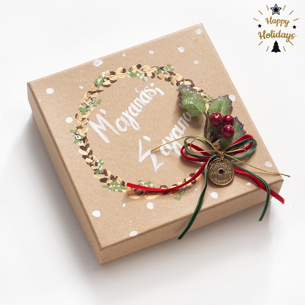 Το Χριστουγεννιάτικο δωράκι για ζευγάρια περιλαμβάνει: 1) χάρτινο ζωγραφιστό κουτάκι σε χρώμα natural με την φράση Μ’ αγαπάς – Σ’αγαπώ 2) δύο κρεμαστά με μεταλλικά μοτιφ , το ένα με το δέντρο της ζωής και το άλλο με το ρόδι.Ένα για ΕΚΕΙΝΗ και ένα για ΕΚΕΙΝΟΝ.