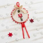 Χριστουγεννιάτικο κρεμαστό διακοσμητικό ξύλινο τελάρο με σαντούκ μεταξωτό εκρού ύφασμα, πάνω στο οποίο είναι ζωγραφισμένος ο καρυοθραύστης σε κόκκινες-μαύρες-λευκές αποχρώσεις. Το τελάρο διακοσμούν κόκκινα pom-pom, κορδέλα κόκκινη, χρυσή και φούντα κόκκινη