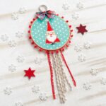 Χριστουγεννιάτικο κρεμαστό διακοσμητικό ξύλινο τελάρο με βαμβακερό ύφασμα βεραμάν με πουά λευκά, πάνω στο οποίο είναι ζωγραφισμένος ο Αγ. Βασίλης σε λευκές-κόκκινες αποχρώσεις. Το τελάρο διακοσμούν κόκκινα pom-pom και κορδόνι εκρού