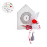 Χριστουγεννιάτικο ξύλινο διακοσμητικό σπιτάκι σε λευκό χρώμα. Το σπιτάκι είναι ζωγραφισμένο με μάτι σε ασημί glitter χρώμα και στολισμένο με σύνθεση από pompom, φτερά.
