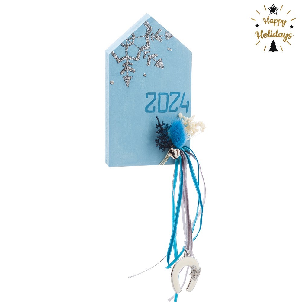 Χριστουγεννιάτικο ξύλινο διακοσμητικό σπιτάκι σε σιελ χρώμα με ασημί glitter.