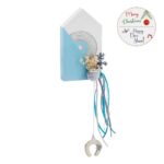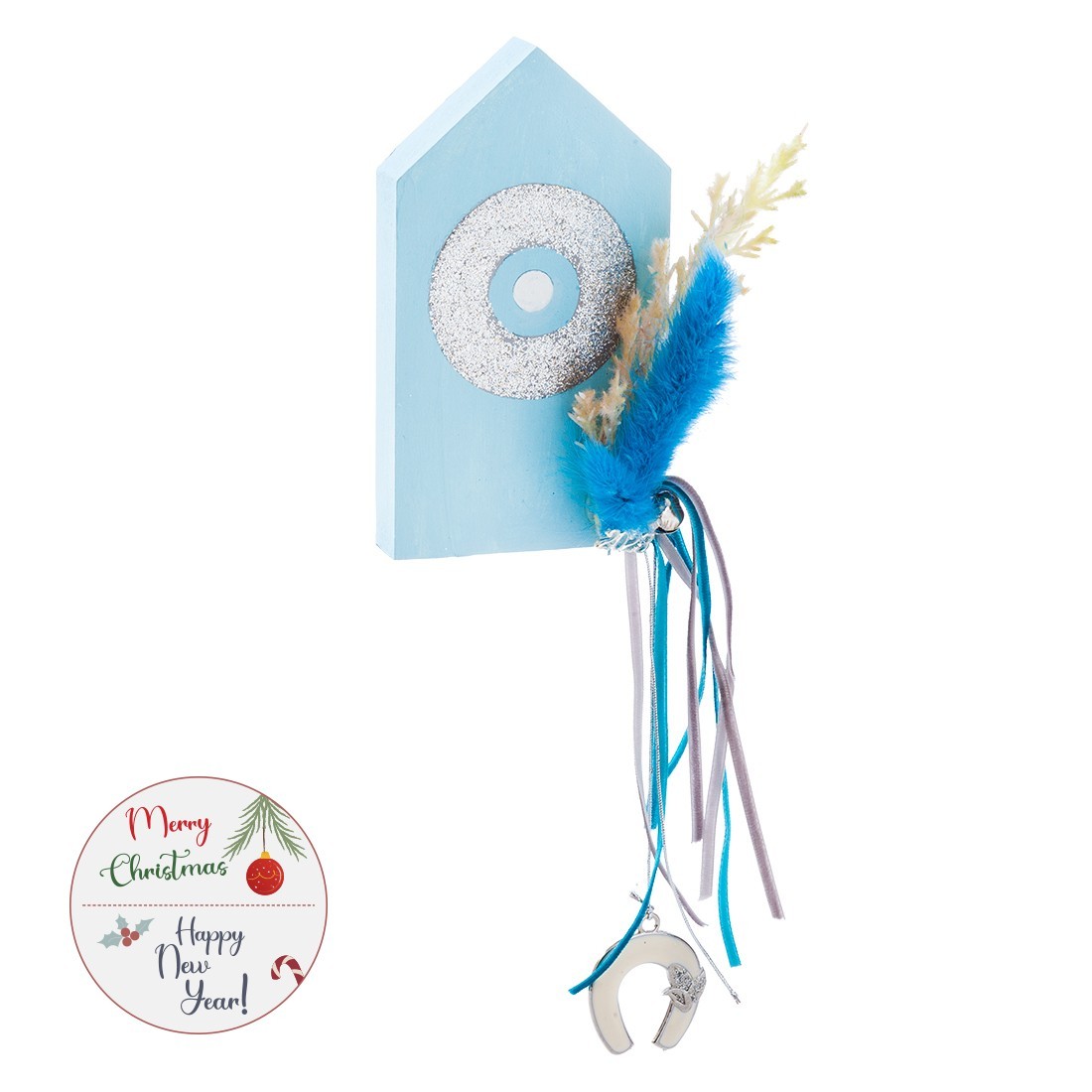 Χριστουγεννιάτικο ξύλινο διακοσμητικό σπιτάκι σε λευκό-σιελ χρώμα με ζωγραφιστό μάτι. Είναι διακοσμημένο με σύνθεση από αποξηραμένα λουλούδια.