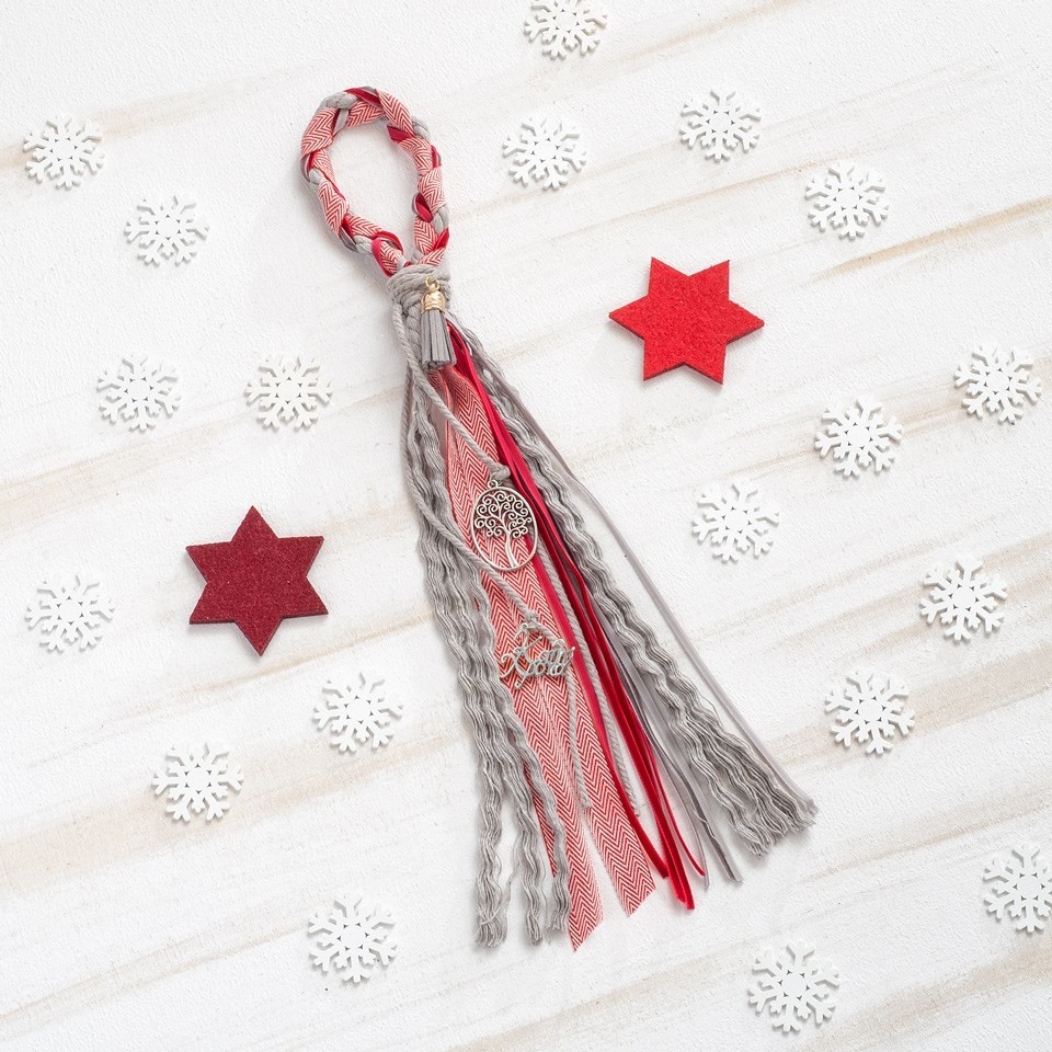 Γούρι κρεμαστό με φτερά χρυσά μέσα σε στρογγυλό πλαίσιο. Το γουράκι κρέμεται από πλεγμένες βελούδινες κορδέλες σε αποχρώσεις κόκκινες-καφέ και εκρού.