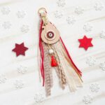 Γούρι κρεμαστό με ρόδι ξύλινο εκρού-κόκκινο. Το γούρι ολοκληρώνει δαντέλα και κορδόνι εκρού, καθώς και κορδονάκι με κρόσια καφέ και λεπτομέρειες κόκκινες