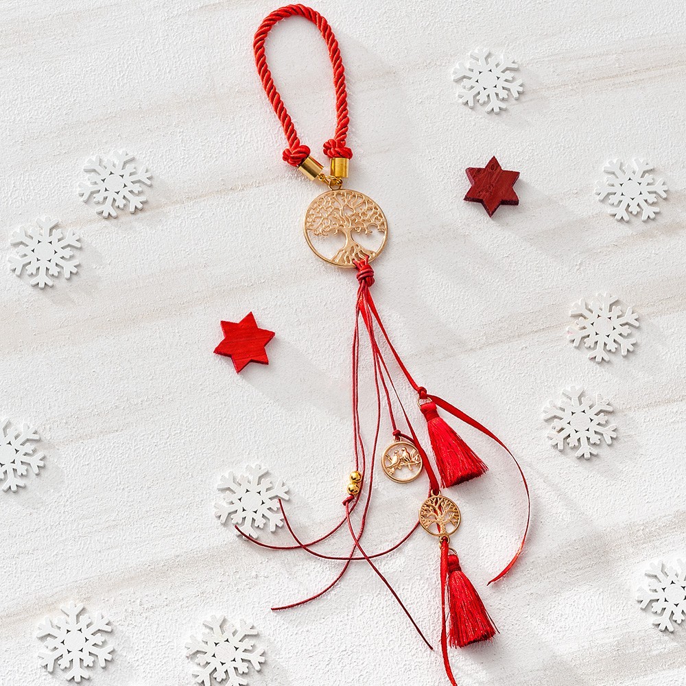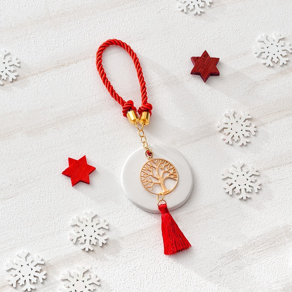 Χριστουγεννιάτικο κρεμαστό γούρι με κεραμικό & μεταλλικό μοτίφ δέντρο της ζωής σε χρυσό χρώμα. Είναι στολισμένο με rayon κορδόνι και φούντα σε κόκκινο χρώμα.