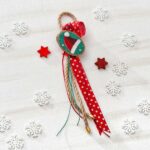 Χριστουγεννιάτικο κρεμαστό γούρι. Το δέσιμο έχει γίνει με κορδόνι γιούτα και κόκκινη γκρο κορδέλα με print αστέρια. Τη σύνθεση ολοκληρώνει ξύλινος κορμός στον οποίο είναι ζωγραφισμένο το σκουφάκι του Άη-Βασίλη.
