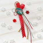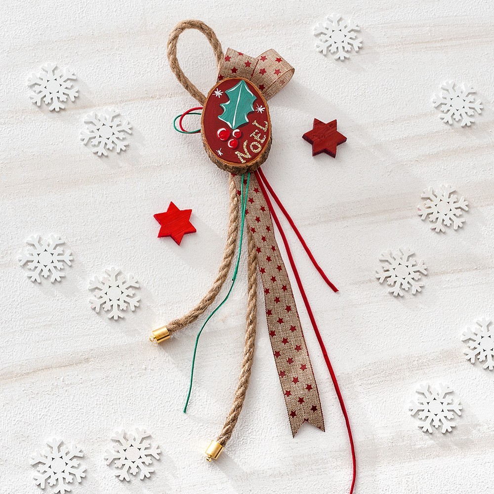 Χριστουγεννιάτικο κρεμαστό γούρι. Το δέσιμο έχει γίνει με κορδόνι γιούτα και κόκκινη γκρο κορδέλα με print αστέρια. Τη σύνθεση ολοκληρώνει ξύλινος κορμός στον οποίο είναι ζωγραφισμένο χριστουγεννιάτικο ζαχαρωτό.