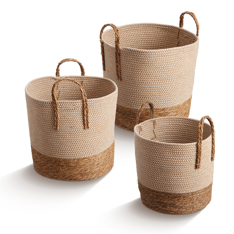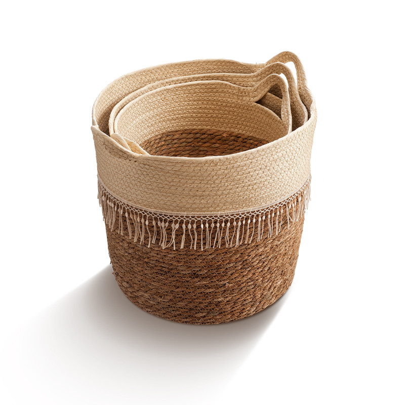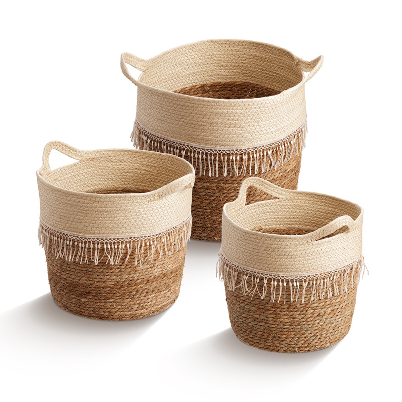 Καλάθια Μπαμπού Καλάθια μπαμπού σετ 3 τεμαχίων. Τα καλάθια έχουν στρογγυλό σχήμα με μαλακή πλέξη, είναι διακοσμημένα με κρόσια και το χρώμα τους είναι συνδυασμός φυσικών και εκρού αποχρώσεων.