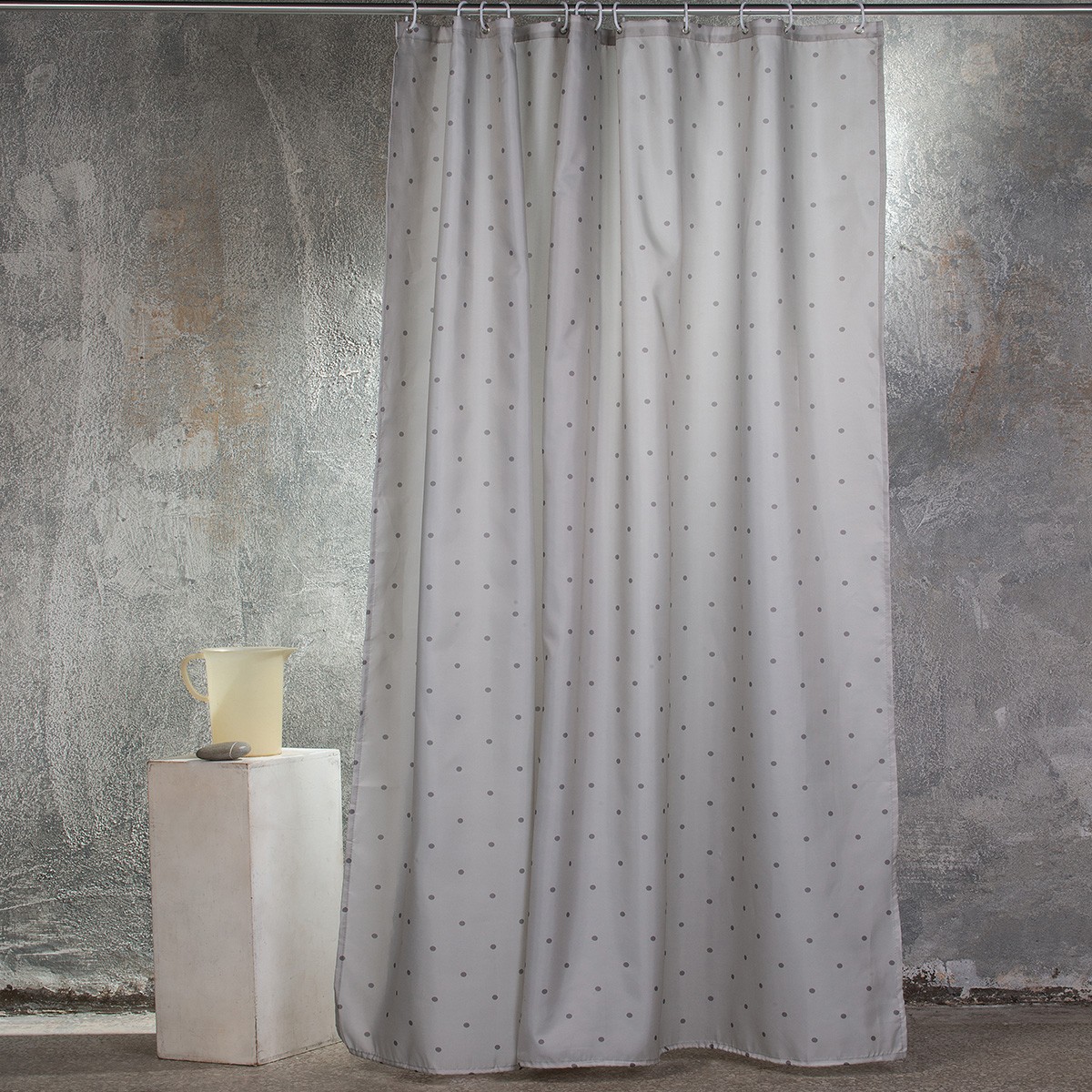 Υφασμάτινη κουρτίνα μπάνιου 180(Π)Χ200(Υ) με πουά σχέδιο, σε ασημί χρώμα, από 100% πολυεστερικό, αδιαβροχοποιημένο ύφασμα. Στη συσκευασία περιέχονται 12 κρίκοι κρέμασης.