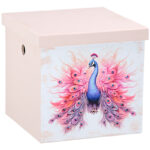 Εντυπωσιακό κουτί βάπτισης κύβος με θέμα παγώνι εξαιρετικής ποιότητας σε ζωηρά χρώματα.