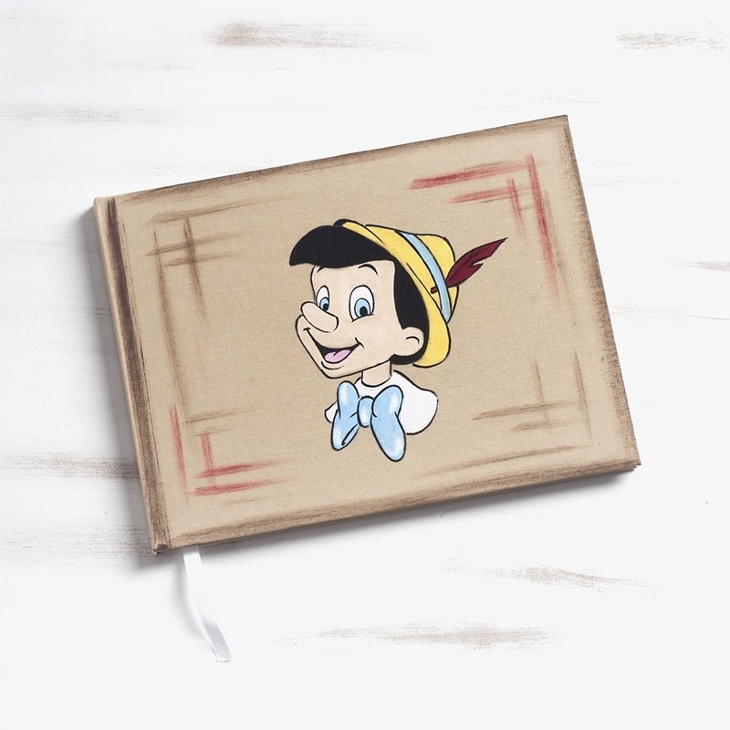 Disney ξύλινος natural κύβος με καπάκι, συσκευασία βάπτισης ζωγραφισμένη στο χέρι με θέμα τον πινόκιο και με σβησίματα καφέ-κόκκινα. Το καπάκι του κουτιού διακοσμεί λινάτσα σε αποχρώσεις σιέλ,κόκκινες,εκρού τυλιγμένη σε ρολάκια και δεμένη με πολύχρωμους σπάγγους