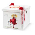 Ξύλινο κουτί βαπτιστικών κύβος σε λευκό χρώμα. Στο μπροστινό μέρος είναι ζωγραφισμένη η Candy Candy μαζί με τον πιστό φίλος της, τον Κλιν. Στο καπάκι του κύβου είναι ζωγραφισμένη η φράση ”Candy Candy” σε κόκκινο χρώμα και είναι διακοσμημένο με λευκές-κόκκινες κόρδελες.