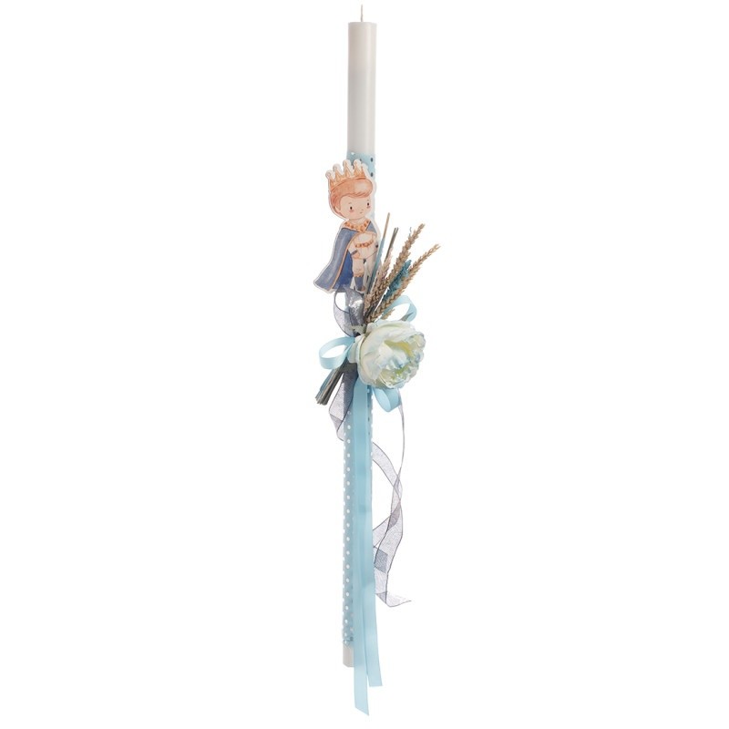 Λαμπάδα βάπτισης ντυμένη με πουά σιέλ ύφασμα. Ο στολισμός περιλαμβάνει μπουκέτο με αποξηραμένα λουλούδια και κοπτικό με τον πρίγκιππα.