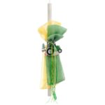 Λαμπάδα βάπτισης με θέμα τα οχήματα. Η λαμπάδα είναι στολισμένη με κίτρινη και πράσινη γάζα και διακοσμημένη με ξύλινη παράσταση που απεικονίζει ένα τρακτέρ.