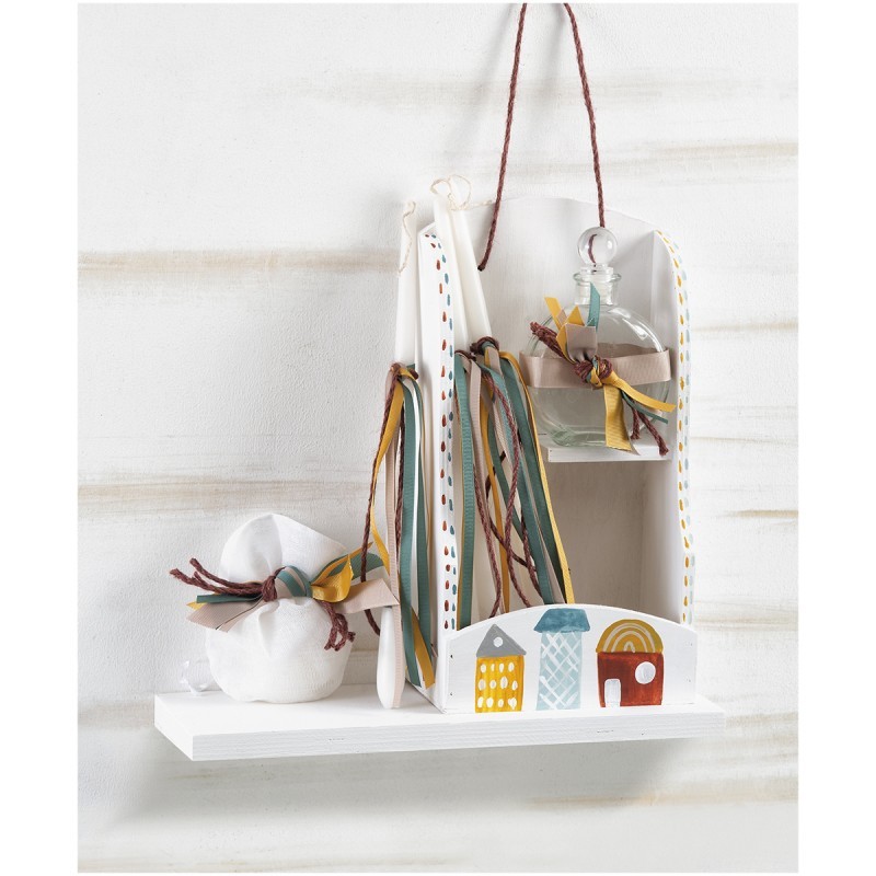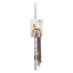 Λαμπάδα βάπτισης τυλιγμένη με βαμβακερό κορδόνι σε εκρού χρώμα και κρεμαστές πολύχρωμες κορδέλες. Η διακόσμηση ολοκληρώνεται με παραλληλόγραμμο καδράκι που απεικονίζει το ουράνιο τόξο σε γήινες αποχρώσεις.