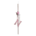Λαμπάδα βάπτισης με χειροποίητα λουλούδια και κορδέλες σε εκρού-ροζ-λευκές αποχρώσεις και διακοσμημένη με ξύλινο μονόγραμμα ονόματος του παιδιού που βαπτίζεται