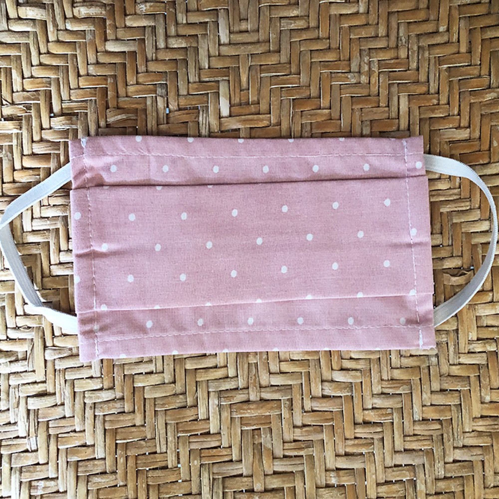 Υφασμάτινη μάσκα προστασίας Rozeta σε ροζ απόχρωση, κατασκευασμένη από διπλό 100% βαμβακερό ύφασμα με πιέτες και λάστιχα για σταθερή τοποθέτηση στα αυτιά. Είναι πλενόμενη, επαναχρησιμοποιούμενη και δεν διαθέτει ρινικό έλασμα.