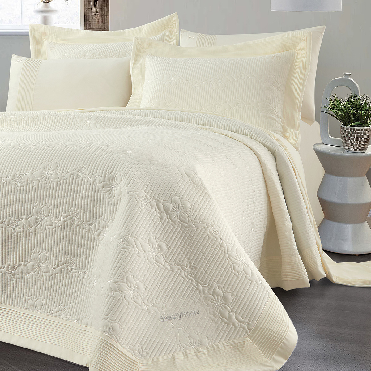 Η Beauty Home θέλει να βρίσκεται δίπλα σας σε κάθε στιγμή της ζωής σας. Σας παρουσιάζουμε την νέα συλλογή μας σε νυφικά σετ ώστε να δημιουργήσετε ένα εντυπωσιακό νυφικό κρεβάτι που θα αποτελέσει το κέντρο της προσοχής στο υπνοδωμάτιο σας την ομορφότερη μέρα της ζωής σας. Το σετ νυφικού κρεβατιού προσφέρει όχι μόνο λειτουργικότητα αλλά αποτελεί την ιδανική επιλογή για να δώσετε μια νότα πολυτέλειας, κομψότητας και ρομαντισμού στον χώρο σας. Το νυφικό σετ 7 τεμαχίων περιλαμβάνει : 1 τεμάχιο κουβερλί σε διάσταση 230×250 το οποίο θα αγκαλιάσει το κρεβάτι σας με μια αίσθηση άνεσης και ζεστασιάς , το σετ συμπληρώνει 1 τεμάχιο πανωσέντονο σε διάσταση 240×260, 1 τεμάχιο κατωσέντονο σε διάσταση 240×260 και 4 τεμάχια μαξιλαροθήκες σε διάσταση 50×70 είναι σχεδιασμένα για να εφαρμόζουν τέλεια προσφέρoντας μια αίσθηση απαλότητας και άνεσης κατά τη διάρκεια του ύπνου. Είναι κατασκευασμένο από microfiber κεντημένο επιλεγμένο με προσοχή για την υψηλή ποιότητα και την αντοχή του, ενώ η υφή του είναι μαλακή και απαλή στην αφή. Είτε πρόκειται για μια κλασική επιλογή είτε για κάτι πιο μοντέρνο και δυναμικό, αυτό το σετ θα σας χαρίσει μια αίσθηση πολυτέλειας και άνεσης κάθε φορά που θα το χρησιμοποιείτε. Προσθέστε οποιαδήποτε τελευταία διακοσμητικά στοιχεία, όπως κουβέρτες ή ρόμπες λουτρού, που θα συμπληρώσουν το στυλ και την αισθητική του νυφικού κρεβατιού σας.