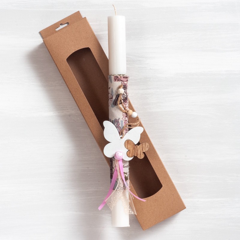 Πασχαλινή λαμπάδα στολισμένη με print φλοράλ ύφασμα και διακοσμημένη με υφασμάτινο αγγελάκι. Η λαμπάδα είναι τοποθετημένη σε χάρτινο natural κουτί με παράθυρο.