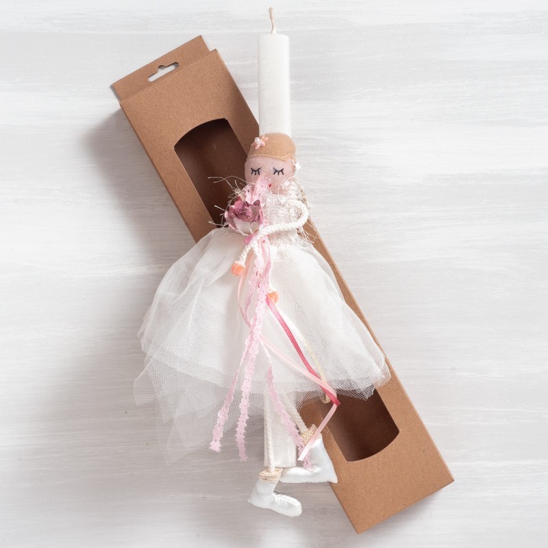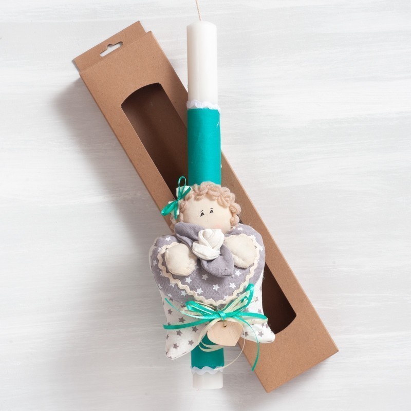 Πασχαλινή λαμπάδα στολισμένη με υφασμάτινο αγγελάκι σε σχήμα καρδιάς. Η λαμπάδα είναι τοποθετημένη σε χάρτινο natural κουτί με παράθυρο.