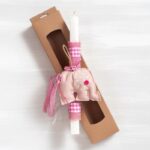 Πασχαλινή λαμπάδα στολισμένη με ροζ λινάτσα και διακοσμημένη με υφασμάτινο ροζ ελεφαντάκι. Η λαμπάδα είναι τοποθετημένη σε χάρτινο natural κουτί με παράθυρο.