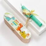 Πασχαλινή λαμπάδα κασετίνα με print αυτοκόλλητο δεινόσαυροι .Η βεραμάν λαμπάδα είναι διακοσμημένη με πολυεστερικό μπρελόκ δεινόσαυρο.